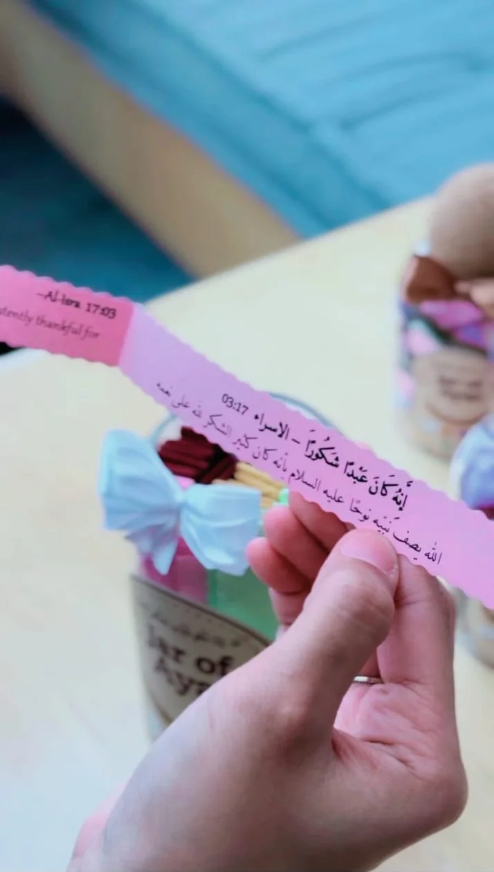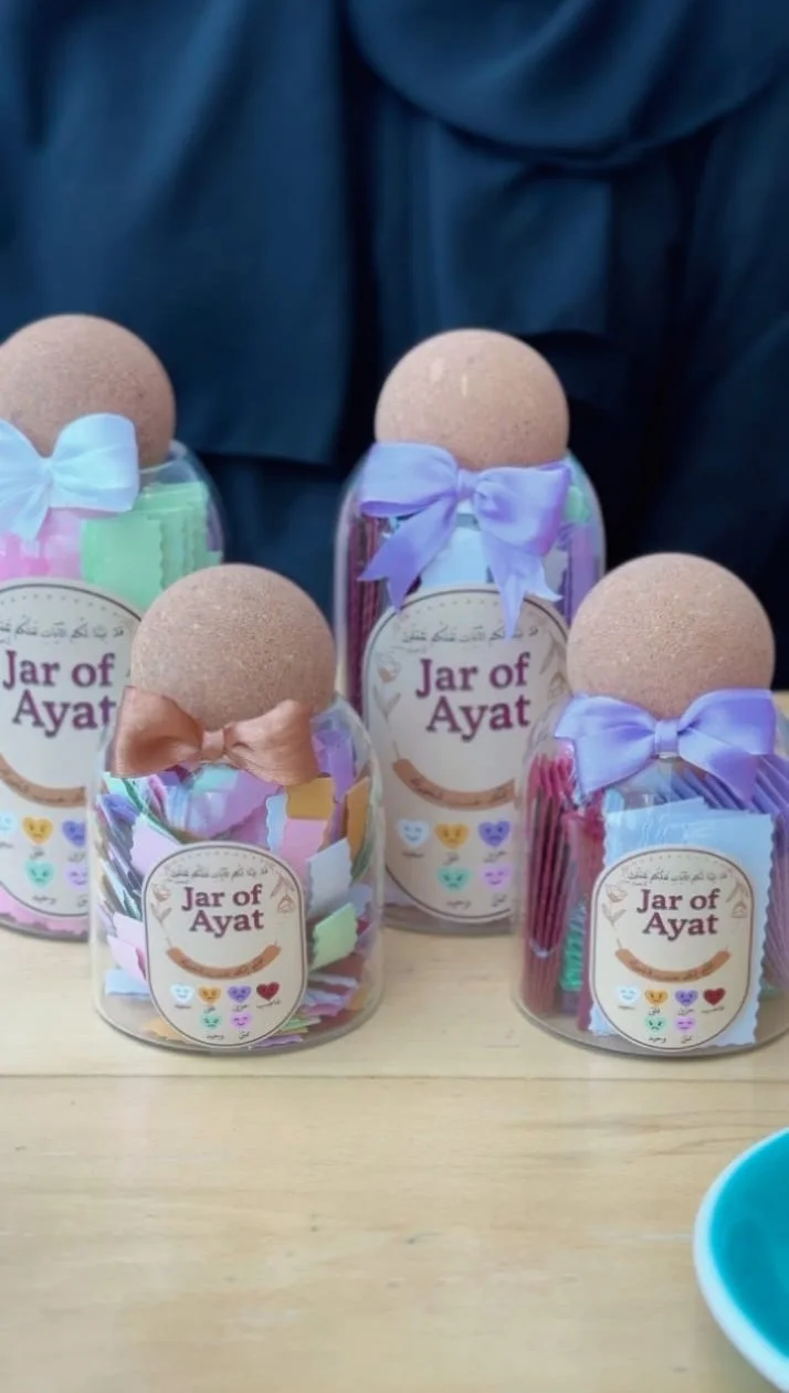 Jar of Ayat هو منتج مُلهم يحتوي على عشرات الأوراق الملوّنة، كل لون يمثل حالة شعورية مختلفة. اختر لون مشاعرك الآن… وستجد آية من القرآن تعطيك رسالة مطمئنة، مناسبة تمامًا لحالة قلبك.